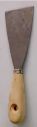 Flexible carbon steel blade extends through handle. Wooden handle with hole.